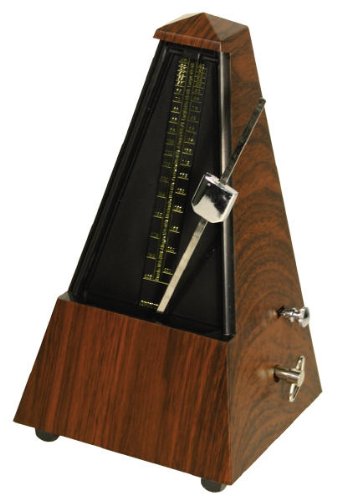 Einstellbar von 40 bis 208 Beats/Minute. Metronom in Pyramidenform mit robustem Kunststoffgehäuse. Farbe: Mahagoni dunkel Mit Glocke (2/4, 3/4, 4/4 und 6/4). Der Schlüssel kann nicht verloren werden. Größe: 220 x 115 x 115 mm (HxBxT)