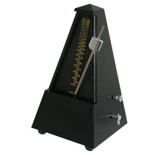Einstellbar von 40 bis 208 Beats/Minute. Mit Glocke (2/4, 3/4, 4/4 und 6/4). Der Schlüssel kann nicht verloren werden. Farbe: Schwarz mit Struktur Größe: 220 x 115 x 115 mm (HxBxT) Metronom in Pyramidenform mit robustem Kunststoffgehäuse.